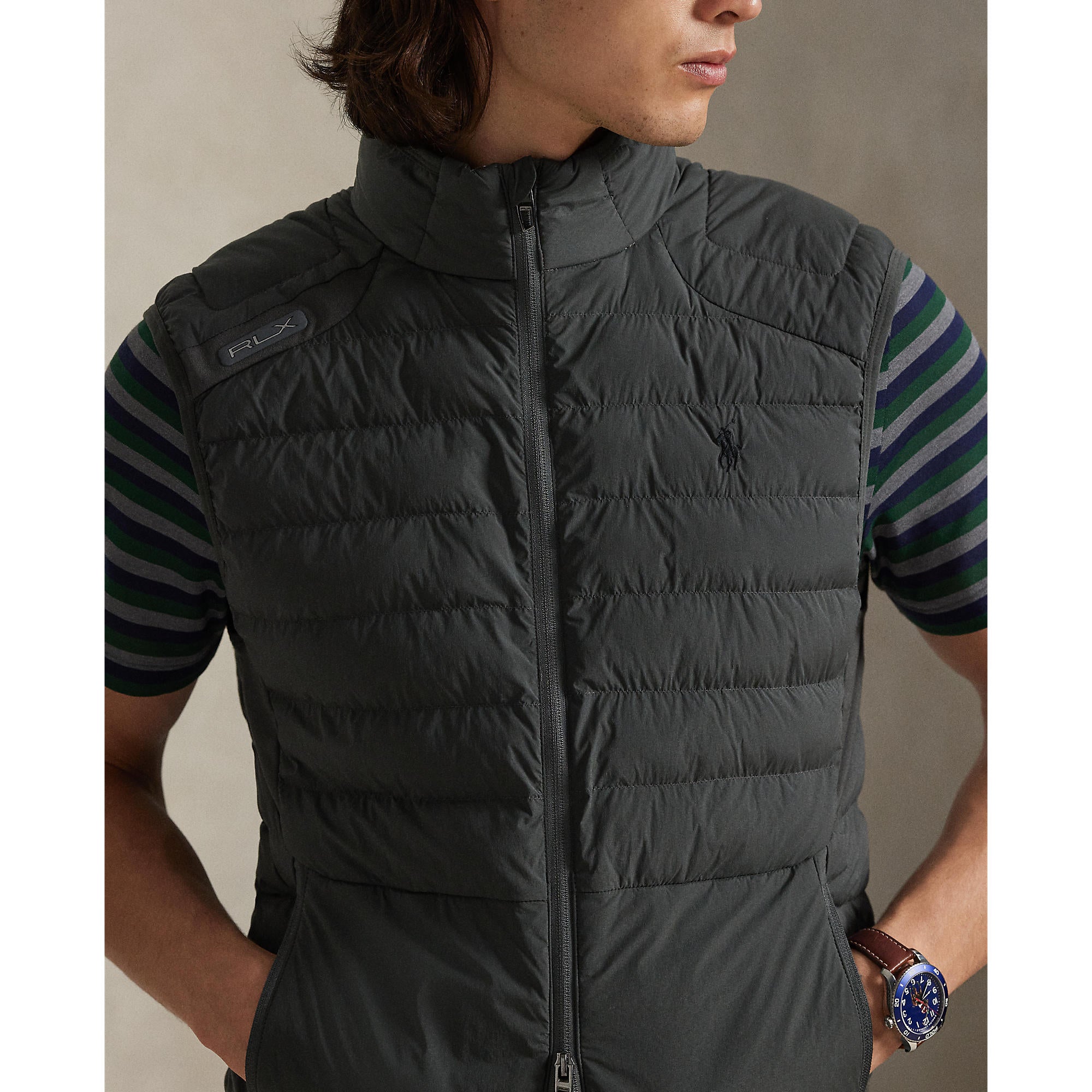 Signature Branding: Embroidered Pony on the left chest and silicone “RLX” tab on the right shoulder.