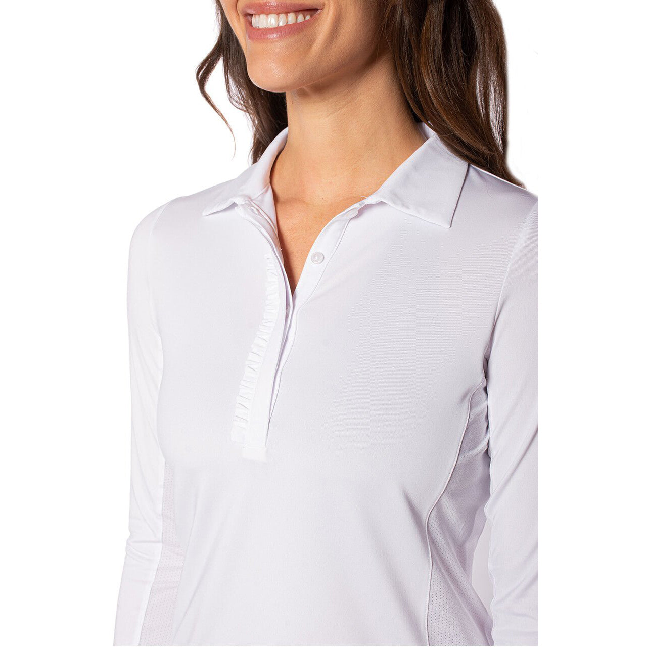 Golftini Damen-Golfshirt mit langen Ärmeln und Rüschen – Weiß
