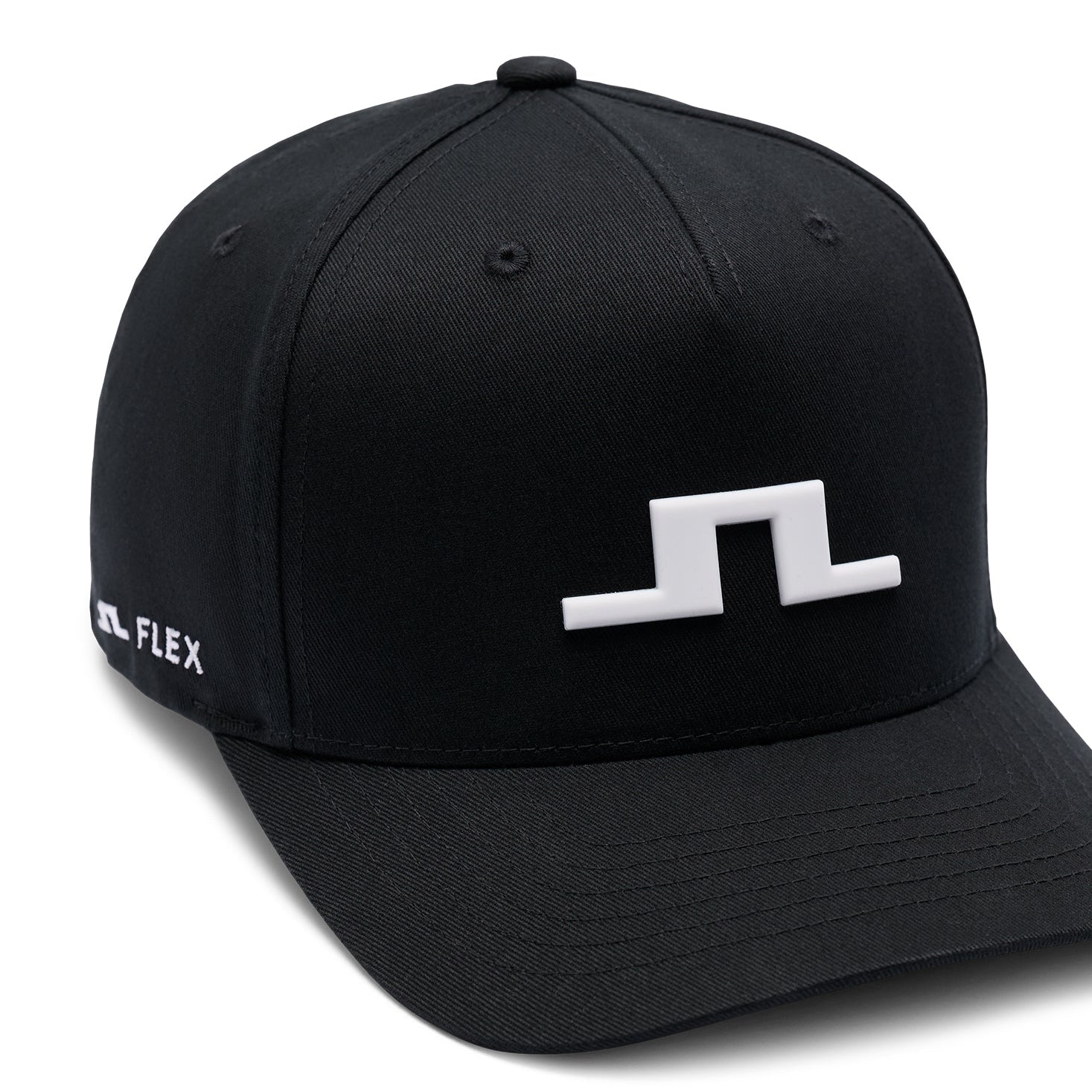 Charakteristisches Branding: Logo-Stickerei vorne in der Mitte, J.LINDEBERG-Branding hinten in der Mitte, geprägtes Logo auf der Anstecknadel und Bridge-Stickerei an der Seite.