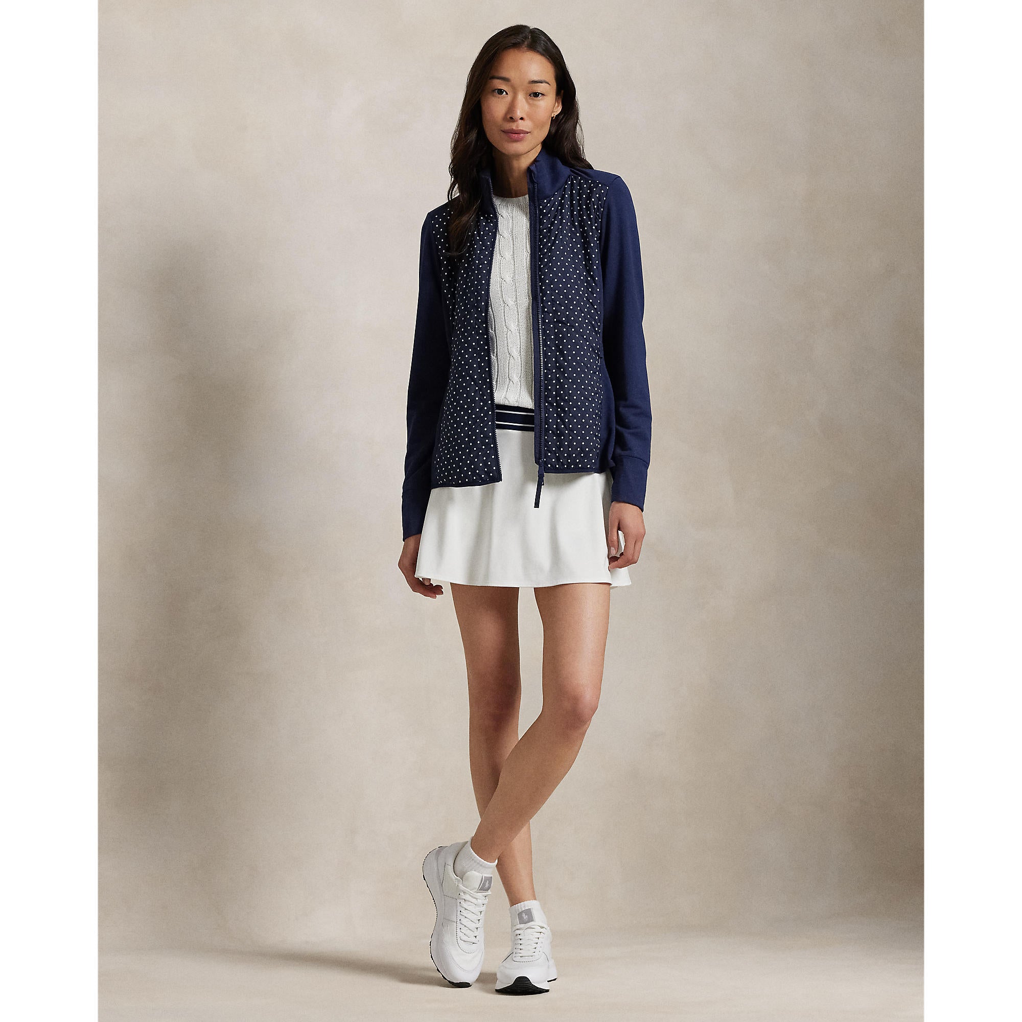 RLX Ralph Lauren Frauen coole Wollhybrid -Leistung Vollzip -Jacke - Raffinierte Marine -Polka Punkt