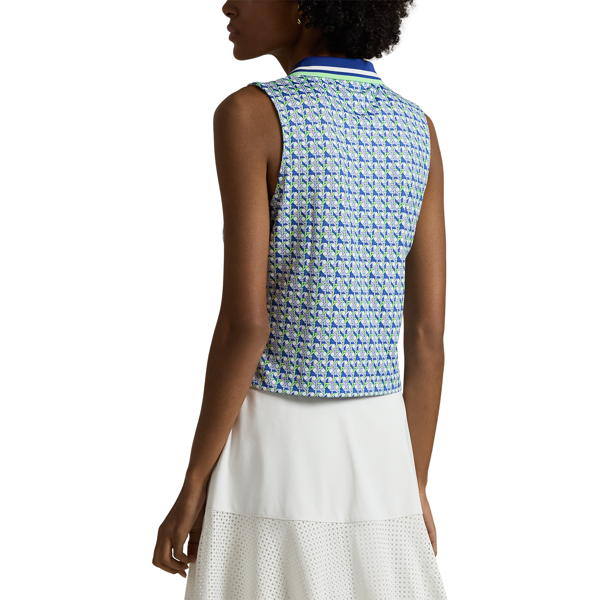 Diese ärmelloses, verkürzte Version unseres Poloshirts besteht aus Stretch Jersey und verfügt über ein kleines Grafikmuster. Es ist mit gestreiftem Kippen am Kragen und unser gedrucktes "RLX" -Logo an der rechten Schulter akzentuiert.