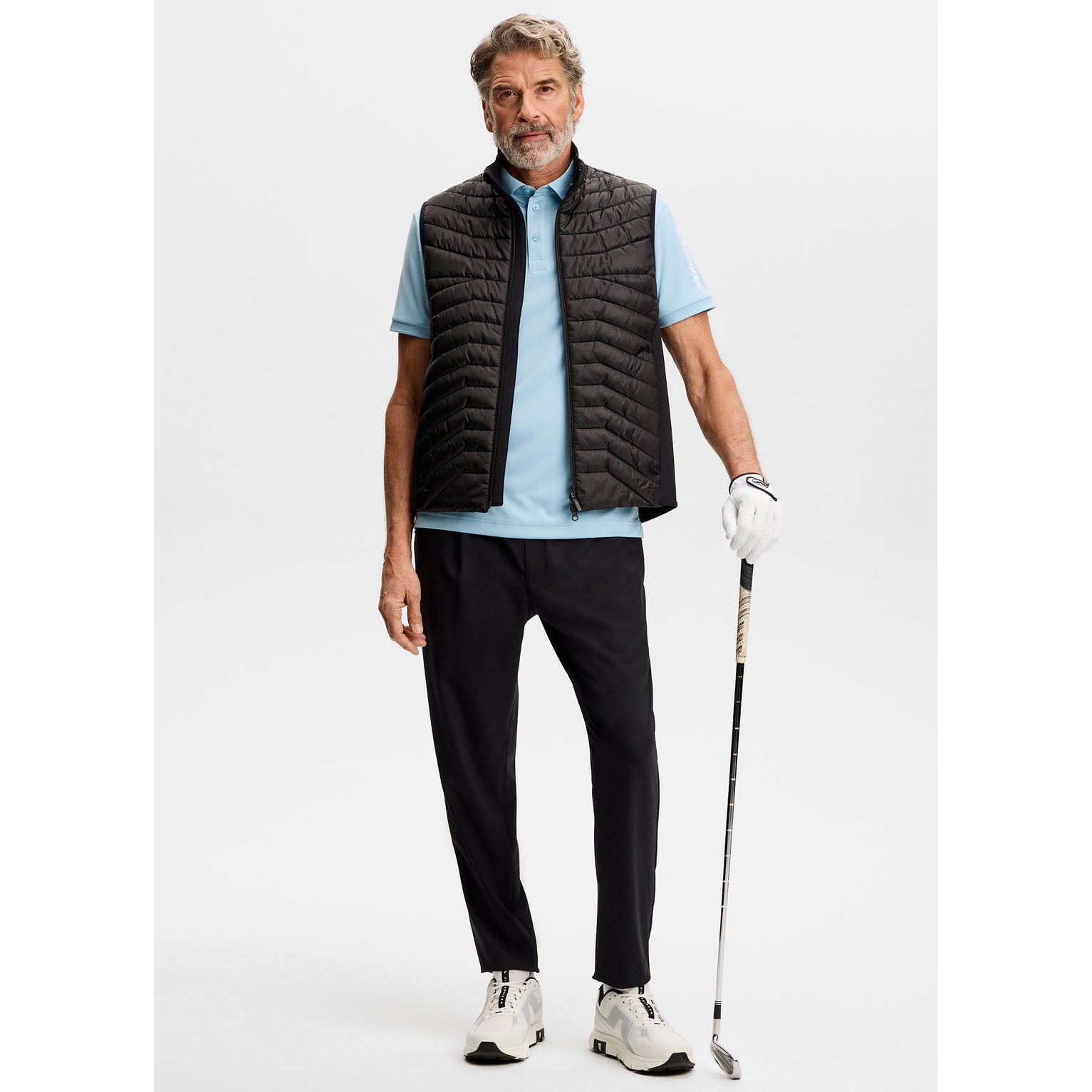 标志性品牌标识:衣领和背面饰有桥形刺绣,袖子上饰有 J.Lindeberg 徽标,打造抛光饰面。